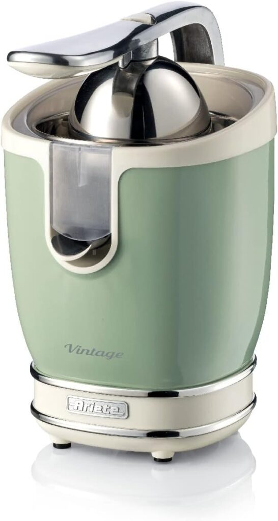 Ariete Espremedor de frutas cítricas elétrico com design vintage e alavanca de pressão, corpo de metal, 2 cones para frutas grandes e pequenas e bico de gotejamento 413/04 verde