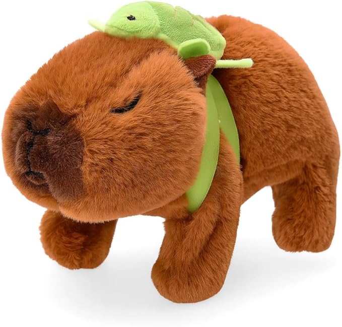 Capivara de Pelúcia Interativa, 15x12cm, com Som e Movimento, Brinquedo que Pula Sozinho, Decorada com Tartaruga Verde (marrom)