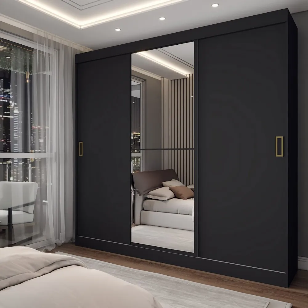 Guarda-roupa Solteiro Triunfo 3 Portas 2 Gavetas Com Espelho Cor Preto