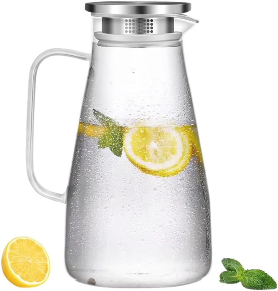 Jarra de Vidro com Tampa, Feita em Vidro Borossilicato e Aço Inoxidável, Jarra de Suco de 1,8 L, Resistente ao Calor e Fácil de Limpar, Style Jarra de Vidro Borossilicato com Alça