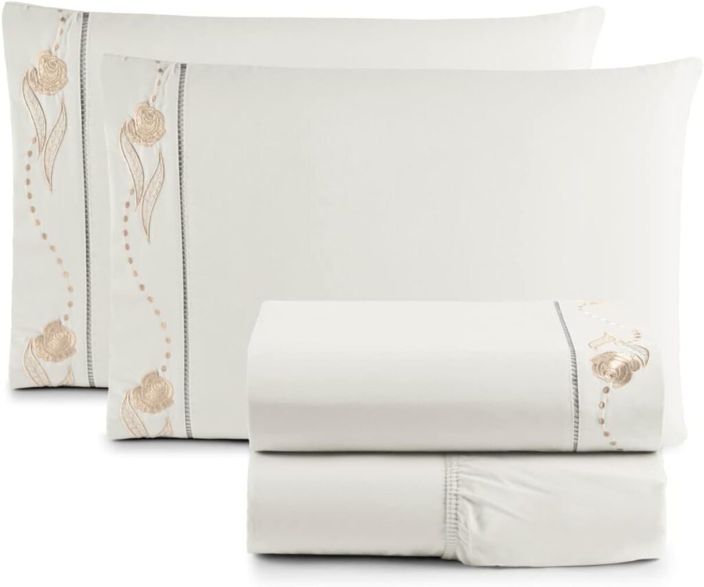 Jogo de Cama Lençol Queen Bordado Imperial Realeza 4 Peças 200 Fios Percal 100% Algodão (PALHA)