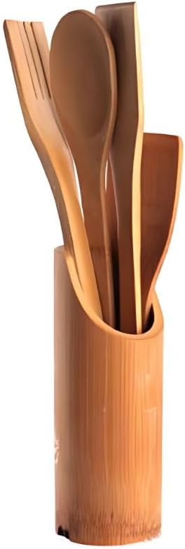 Kit Utensílios de Bambu 5 Peças com Suporte, Ecológico, Durável e Ideal para Cozinhar com Estilo e Praticidade