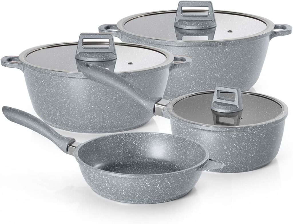 MODA DO CHEF Jogo de Panelas Antiaderrnte 4 Peças Graniflon Cinza com Frigideira Caçarolas e Panela Antiaderente Premium, tampa de vidro Leve Fácil de Limpar Ideal para o Dia a Dia