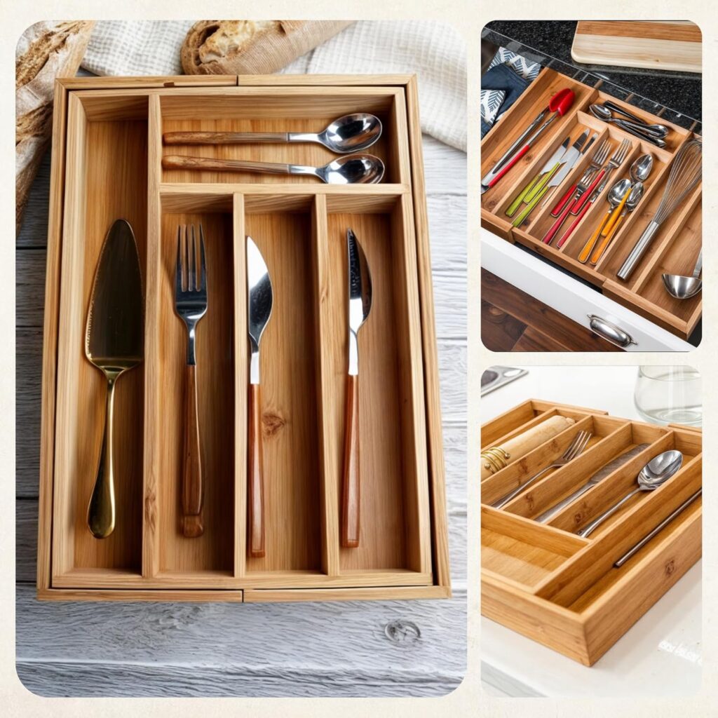 Porta Talheres Organizador de Gavetas e Bandejas Armários Madeira Bambu Ajustável com 7 Compartimentos Expansível Tamanho Grande Lápis Cozinha Escritório Escrivaninha Ateliê Sala Escola Colégio