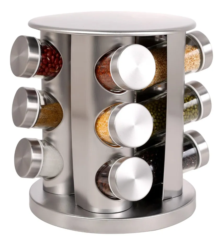 Porta Tempero Giratório 360 com 12 potes vidro suporte inox