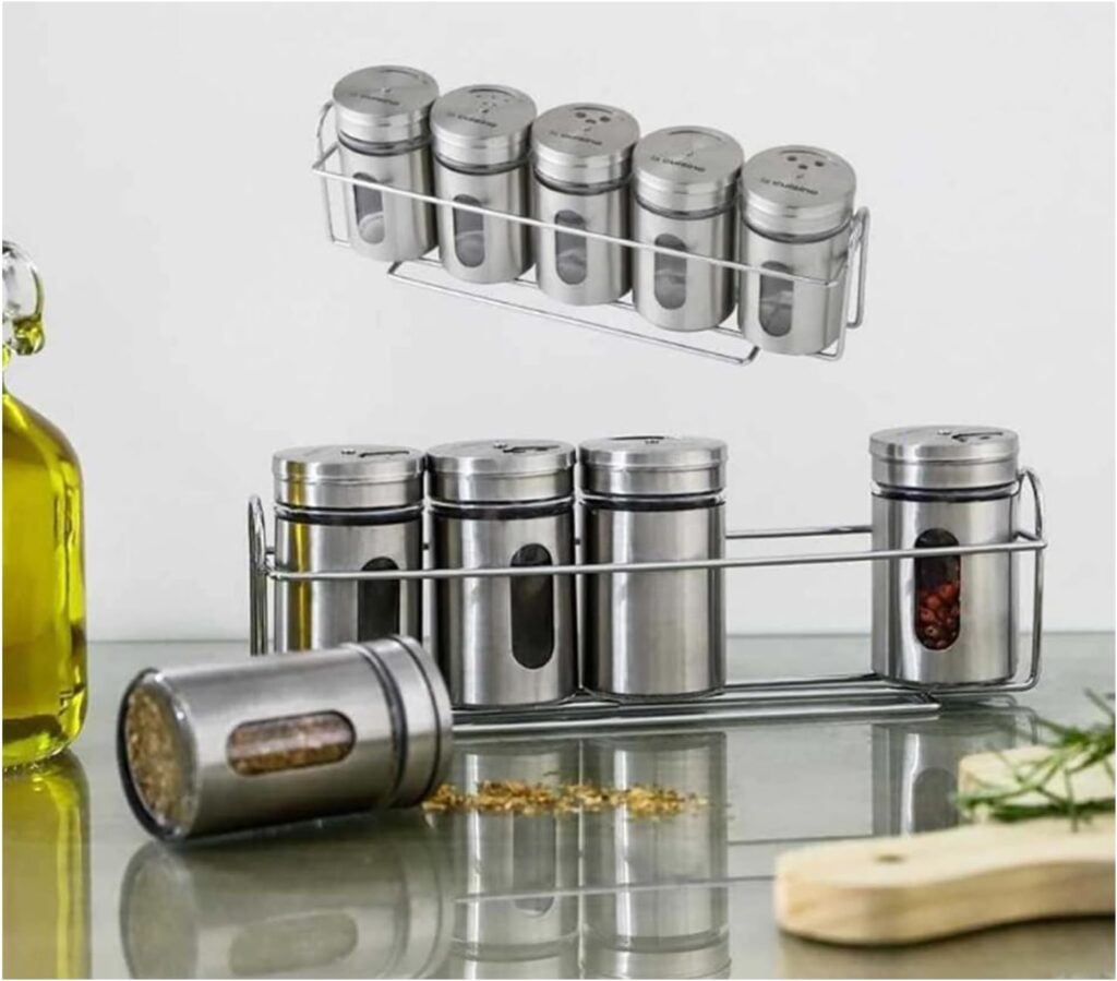 Porta Temperos Condimentos em inox saleiro pimenta com suporte – 6 peças