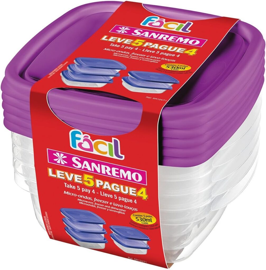 Sanremo – Conjunto de 5 Potes Plástico Hermético de 530 ml, Linha Fácil
